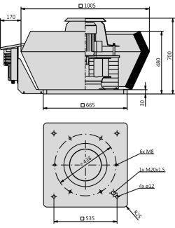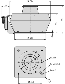 Przystosowany jest do montażu na dachu, posiada wyrzut pionowy. Przeznaczony jest do pracy ciągłej.