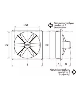 Wentylatory standardowo dostarczane w wersji wyciągowej (A) - kierunek przepływu od silnika do wirnika. Na zamówienie wykonywana jest wersja (B) – wersja nawiewna o odwrotnym kierunku przepływu.