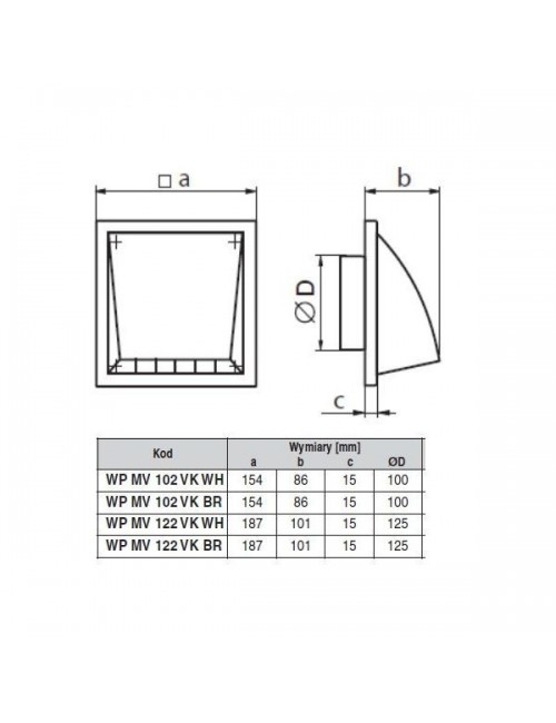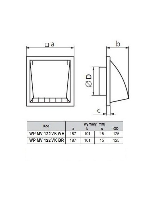 Kratka wentylacyjna wywiewna wyposażona w okap oraz zawór zwrotny. Znakomicie chroni przewód wentylacyjny w cięzkich warunkach atmosferycznych, do stosowania na zewnątrz. Występuje w dwóch kolorach białym oraz brązowym o średnicy fi 125 oraz wymiarach 187x187mm.