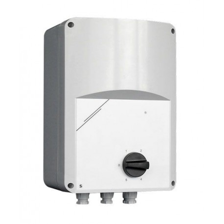 Transformatorowy regulator prędkości obrotowej do jednofazowych (230V, 50Hz) silników urządzeń rotacyjnych (wentylatory, pompy). Obudowa wykonana z odpornego na uderzenia i promieniowanie UV tworzywa ABS lub blachy stalowej w kolorze białym (RAL 9002). Montaż natynkowy. Stopień ochrony: IP54. Pięciostopniowa regulacja za pomocą potencjometru. Wbudowane zabezpieczenie termiczne (TK), do którego należy podłączyć końcówki termokontaktu wbudowanych w regulowany silnik. Dioda sygnalizująca podłączenie napięcia.