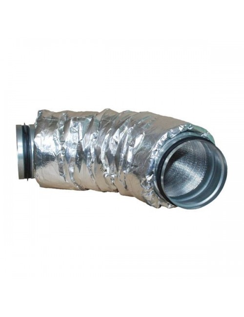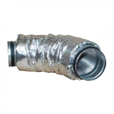 Elastyczny tłumik akustyczny FLEXITEC do kanałów okrągłych z przyłączem nyplowym. Wnętrze składa się z wielu warstw falistego i perforowanego aluminium, warstwę zewnętrzną stanowi płaszcz z aluminium wzmocnionego włóknem szklanym.